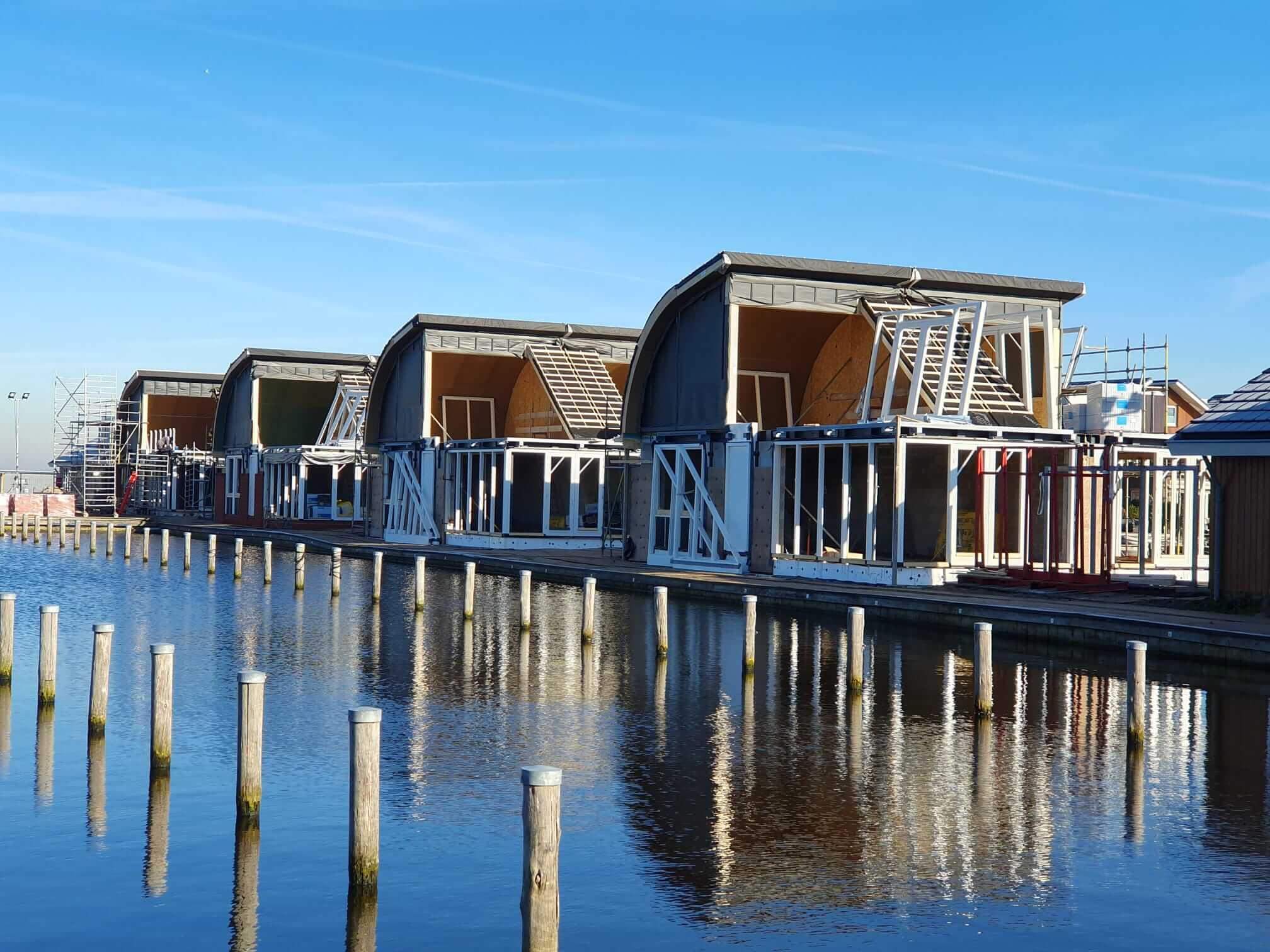 Houtbouw ’t Zand is expert in het maken van ronde daken, ook op zo’n bijzonder mooie locatie als deze. Op een landtong bij de jachthaven van Uitgeest hebben wij de elementen geproduceerd en gemonteerd van deze 8 recreatiewoningen.
